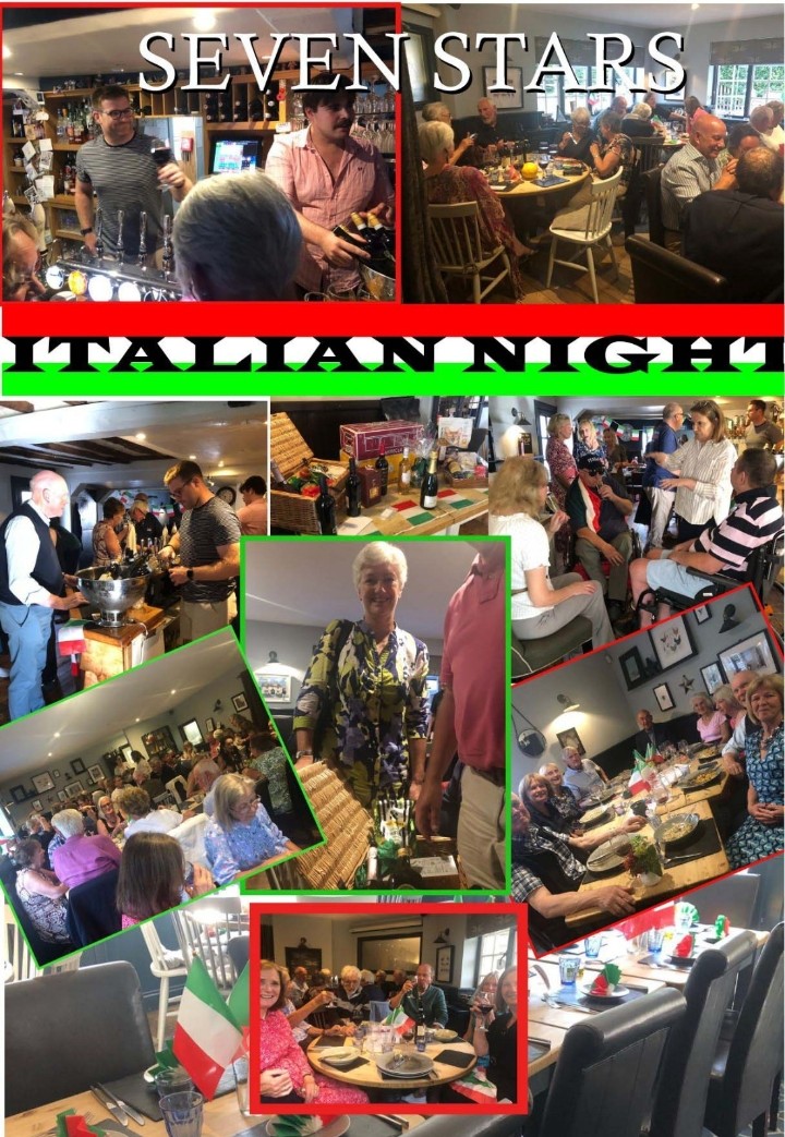 6th July 2025 - Italian Evening at Seven Stars The Seven Stars hosted an Italian evening to raise money for the village hall. 60 people assembled in the pub to be served a 2 course Italian meal withwine. Dave Berry and his family prepared and served the food which was well received by all people present. A raffle was held and a good sum of money was raised for the village hall restoration fund. A lot of team effort went into the organisation of the event thanks to all involved.