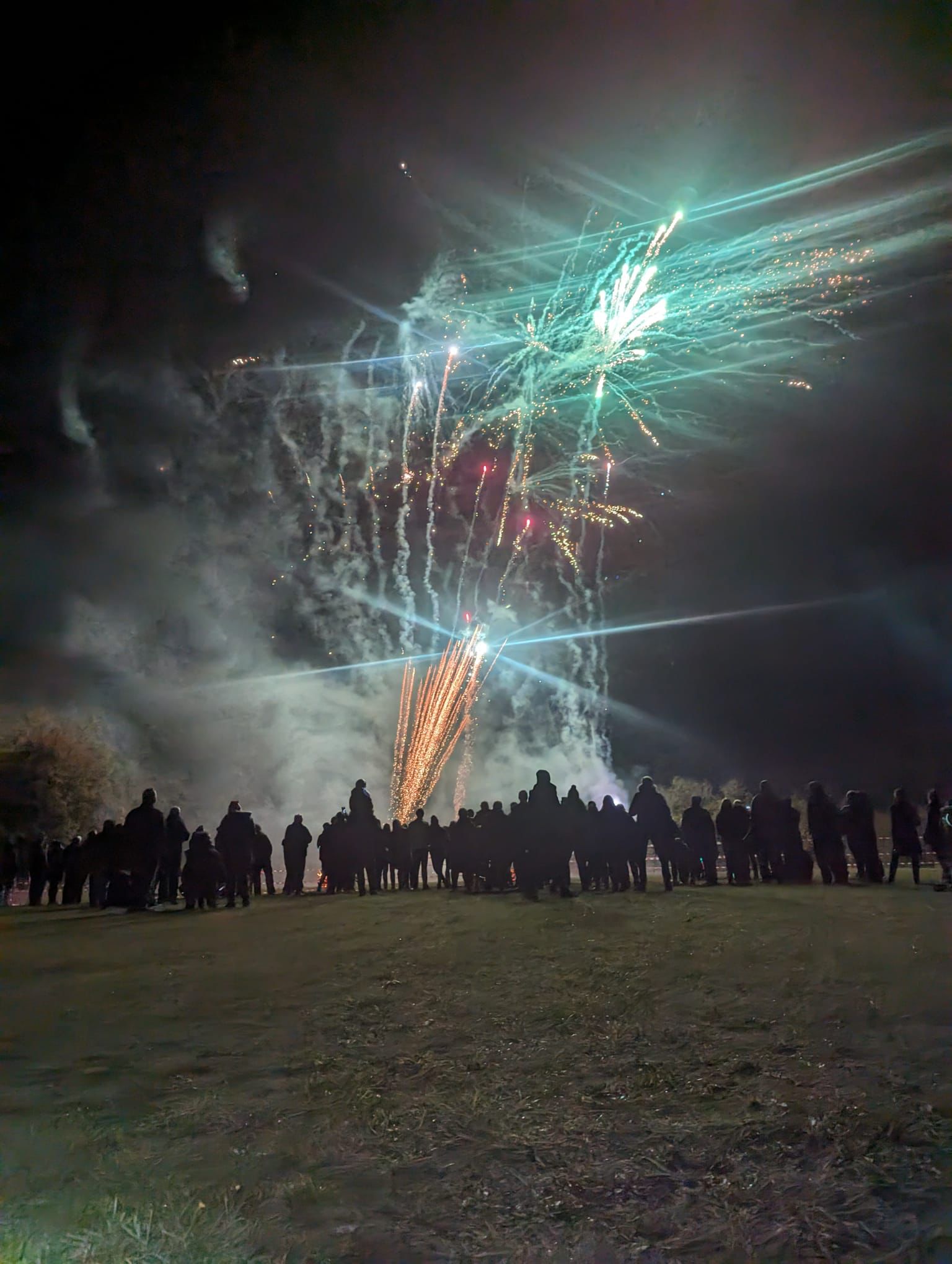 1st November 2025 - Fireworks on Dinton Parish Field Saturday 1st November a capacity crowd started at the Dinton Cricket Club. Helios, God of Fire, performed a stilt dance with lights sparkling from all parts of his body. BBQ was available burgers and sausages supplied by Starveall Farm and soup from Seven Stars. Mulled wine and ale was enjoyed and children given glow lights and toffee apples.Fireworks on the Parish Field. Full report on Community Events.