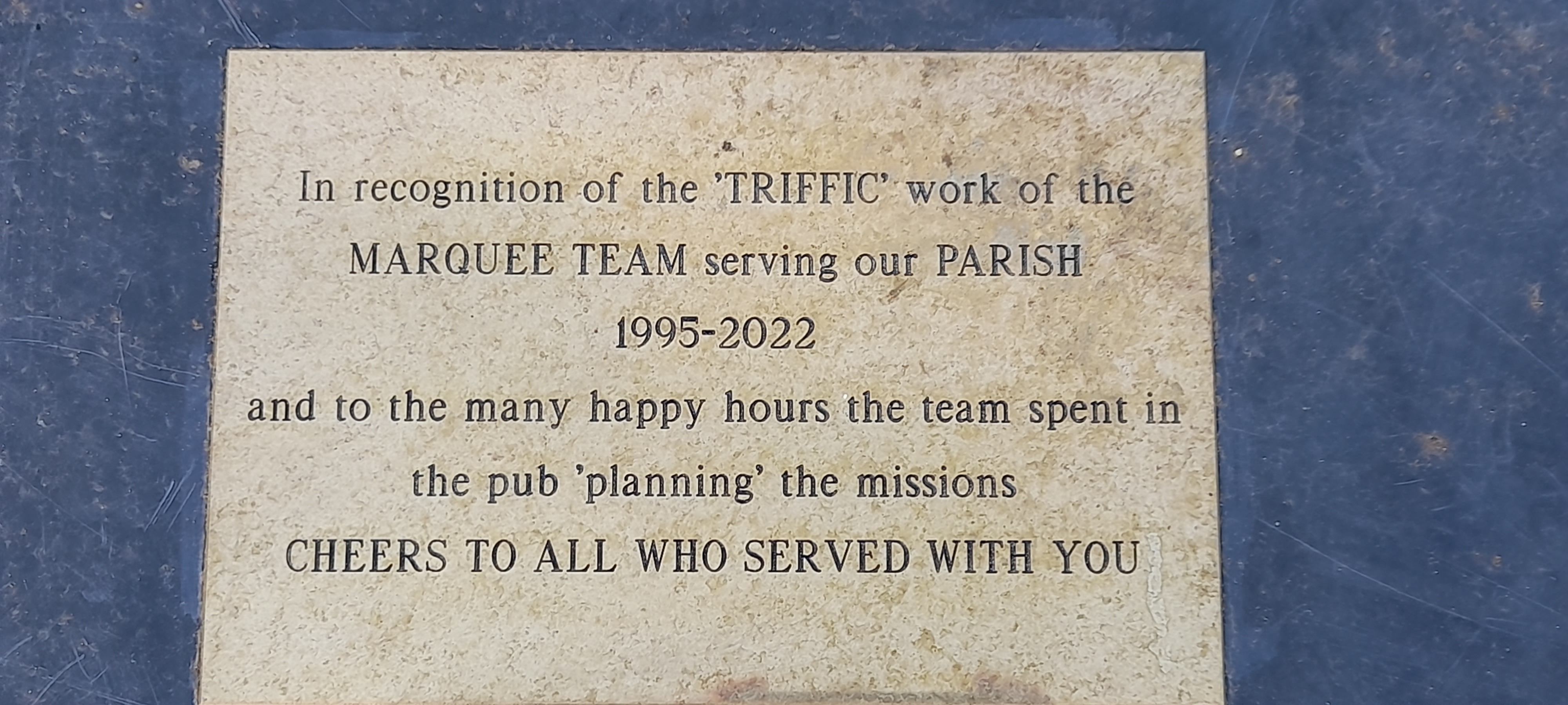 13th April 2024 - Marquee Team Stone Plaque Ceremony In 2023 there was a merger of the old Marquee Team into the Community Events Team. The marquee itself is now under the control/ownership of Dinton Cricket Club who are responsible for the maintenance, security, storing etc. The marquee remains available for use by the CET for any events we may wish to stage within. To commemorate the fantastic work and events staged by the Marquee Team over a quarter of a century, the CET held a ceremony in the Seven Stars Garden late pm Saturday 13th April when a stone and plaque was placed over the spot where the annual Christmas Tree stands as a lasting tribute to the Marquee Team.