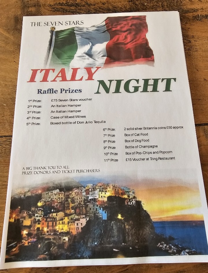 6th July 2025 - Italian Evening at Seven Stars The Seven Stars hosted an Italian evening to raise money for the village hall. 60 people assembled in the pub to be served a 2 course Italian meal withwine. Dave Berry and his family prepared and served the food which was well received by all people present. A raffle was held and a good sum of money was raised for the village hall restoration fund. A lot of team effort went into the organisation of the event thanks to all involved.