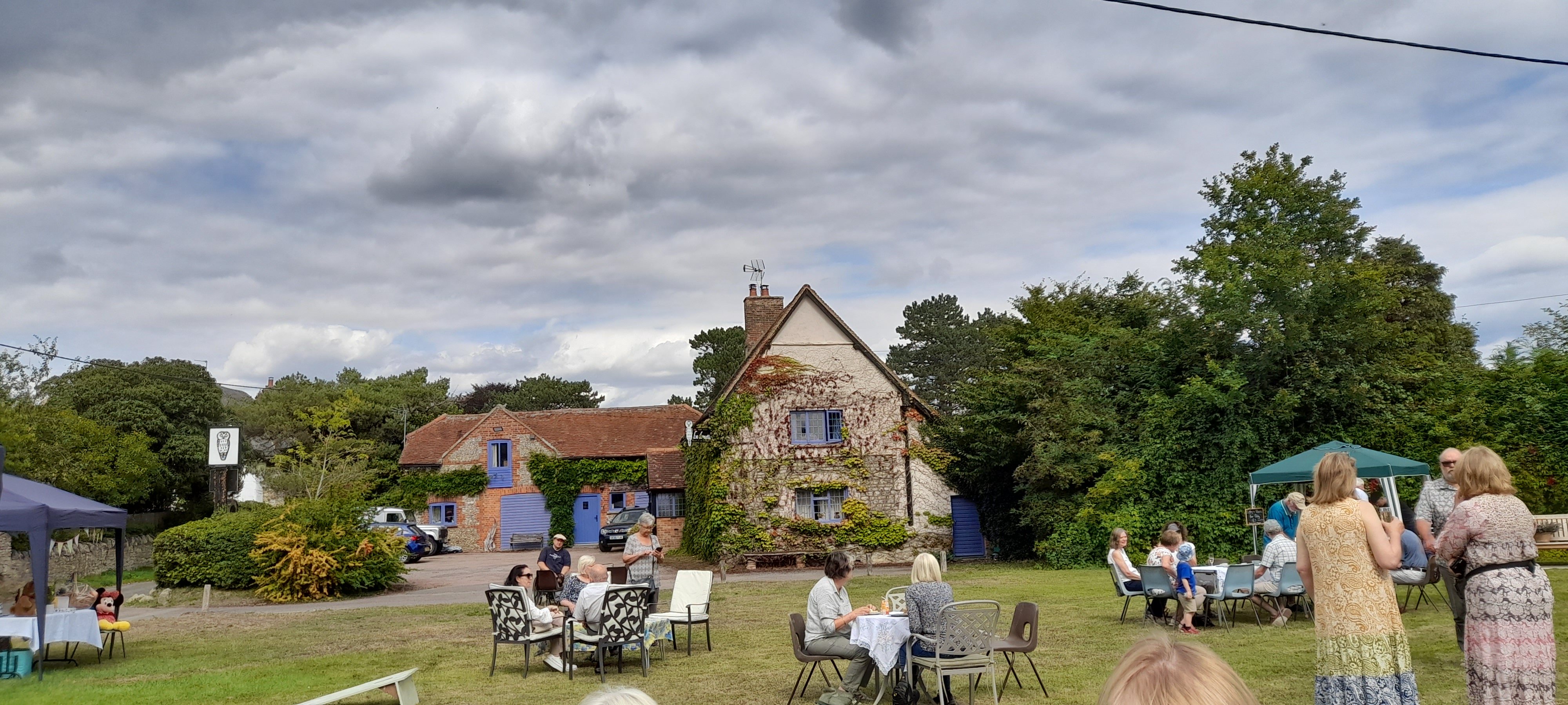 24th August 2025 - Tea Party held on Westlington Green Tea on the Green was held on Westlington Green on Bank Holiday Sunday 2-5pm. Cakes were donated by villagers and a good crowd enjoyed tea and cake, with games for the kids and a raffle. Dinton Folly wine was also on offer. All money raised will go towards the Dinton Village Hall Fund.